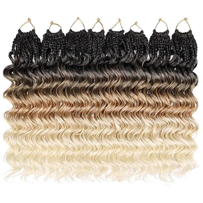Leeven 10 Inch Pre Looped Ocean Wave Crochet Hair 8 Packs Boho Ocean Braids 3 Tone Ombre Blonde Short Curly Crochet Hair Pre Twisted Synthetic Deep Wavy Crochet Hair for Women