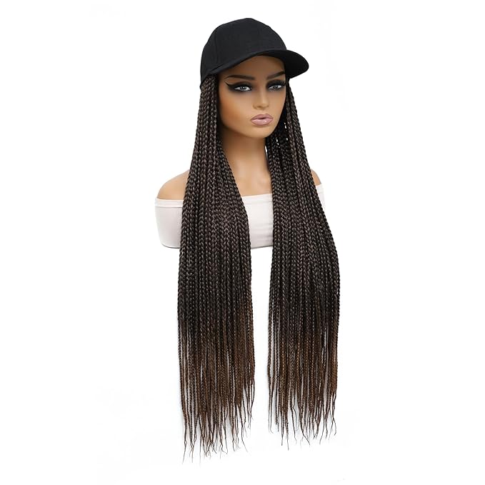 Braided Baseball Cap Wig Box Braid Hair Extensions with Hat Ombre black dark brown Cap Wig with 30inch Long Synthetic Braiding Hair for Women (30in-T30)