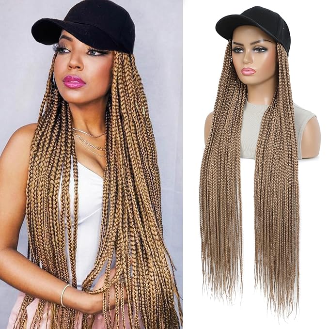 Braided Baseball Cap Wig Box Braid Hair Extensions with Hat golden brown Cap Wig with 30inch Long Synthetic Braiding Hair for Women (30in-27)