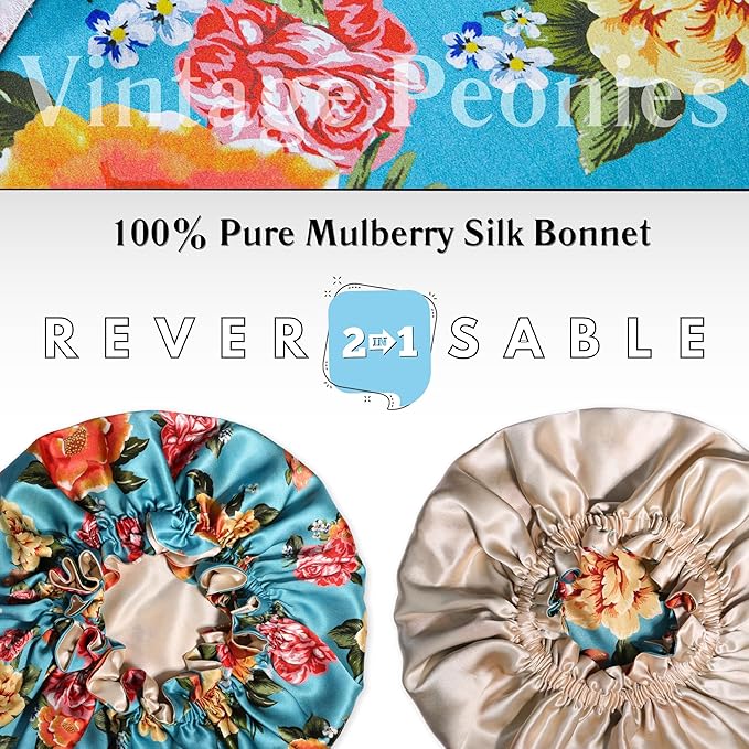 100% Mulberry Silk Bonnet for Women – Handmade in USA, 19 Momme Double-Layer Reversible Hair Wrap, Non-Slip Sleep Cap for Curly & Natural Hair, Luxury Hair Protection (Blue Peonies)