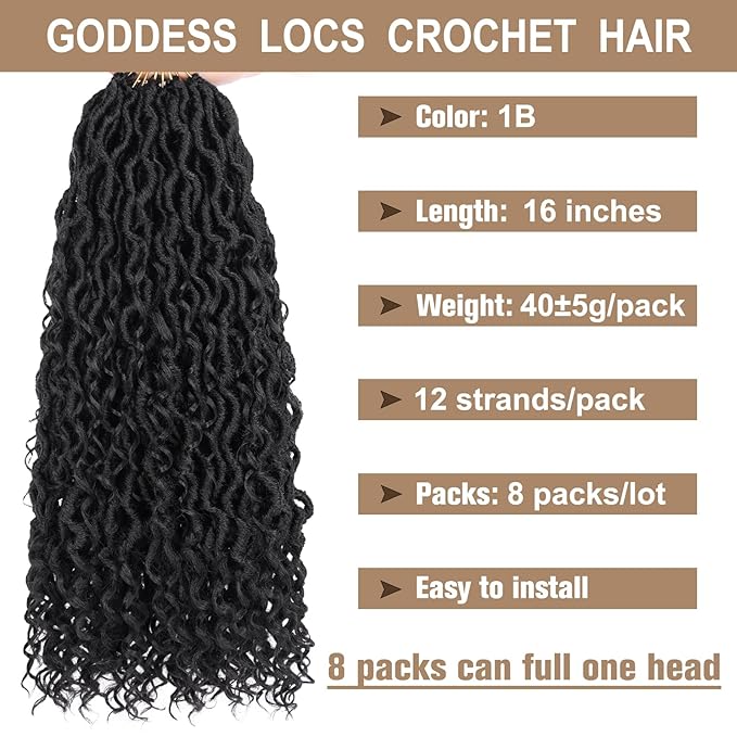COOKOO 16 Inch 8 Packs Goddess Locs Crochet Hair 12 Stands/Pack Boho Faux Locs Crochet Hair with Curls Pre Looped River Locs Hair for Women Bohemian Locs Synthetic Hair Extensions 1B#
