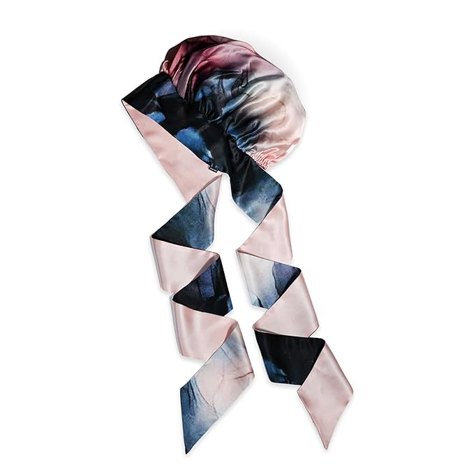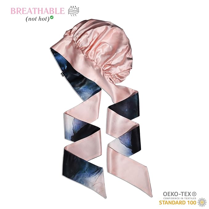 100% Mulberry Silk Bonnet with Ties – Adjustable 19 Momme Double-Layer Reversible Hair Wrap – Stay-On Sleep Cap for Women, Curly Hair, Natural Hair Care – Handmade in USA (Blue & Blush)