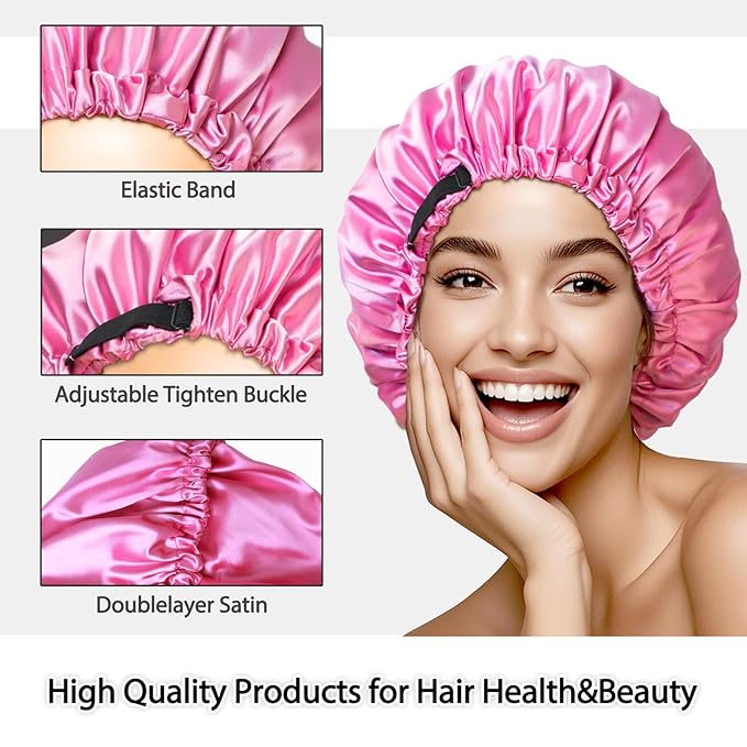 - Premium Quality & Luxurious Material: This bonnet is made of satin fabric. Soft to the touch like silk, smooth and breathable, preventing overheating, providing excellent protection and comfort during sleep. Smooth satin fabric is very soft and gentle on hair, reducing friction and preventing frizz.The double layer satin fabric design helps to lock in moisture, improve hair texture, and ensure that your hair remains hydrated and in its best condition.