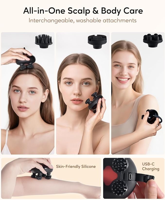 - Tangle-Free Silicone Heads: Soft, eco-friendly silicone claws with a V-shaped design glide through all hair types without pulling or tangling, delivering a smooth massage experience