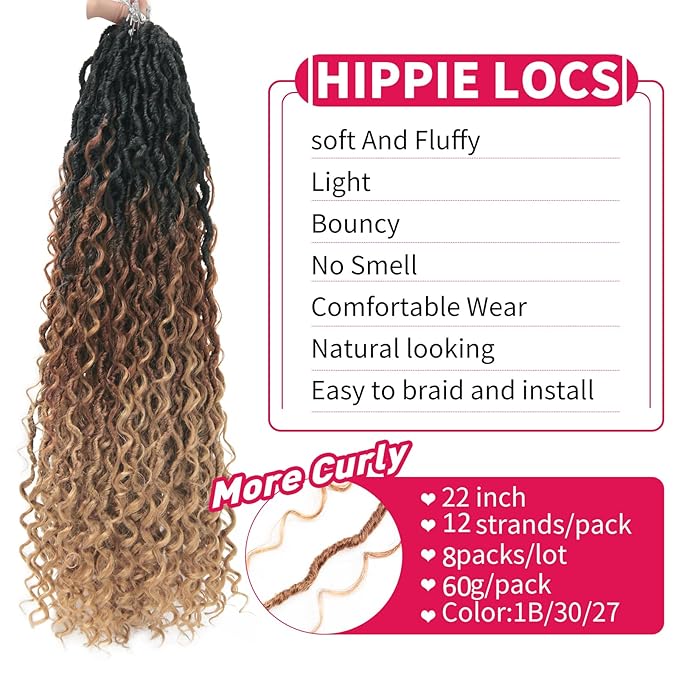 Goddess Locs Crochet Hair 22Inch 8Packs Crochet Locs,Boho Faux Locs With Curly Ends River Hippie Locs Bohemian Locs Crochet Braids(1B/30/27, 22inch(Pack of 8))