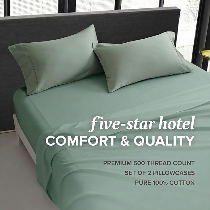 - Premium 100% Cotton Fabric: Made from ethically sourced, breathable cotton, our sateen queen pillowcases (20" x 30") ensure optimal airflow to keep you cool all night. Unlike synthetic blends, natural cotton wicks moisture away from your skin, reducing night sweats and enhancing sleep quality. Our 500 thread count pillow cases set of 2 queen size deliver a crisp, luxuriously smooth texture that becomes softer with each wash