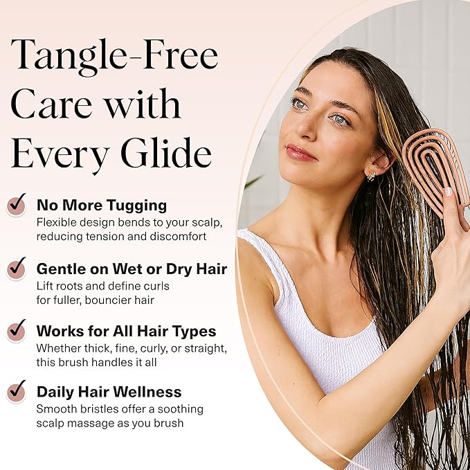 - GENTLER ON HAIR, LESS BREAKAGE: This flexible detangling brush features a bendable frame that adapts to the natural shape of your head for a smoother brushing experience. By moving with your scalp instead of against it, the brush minimizes snapping, tugging, and split ends while working through tangles. A must-have detangler brush for healthier strands—and a perfect size for holiday stocking stuffers.