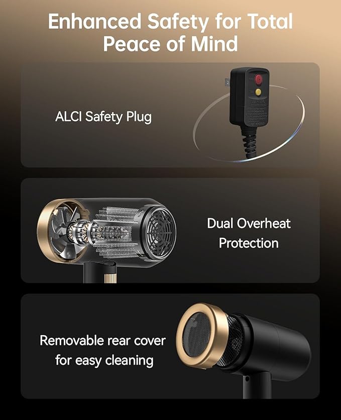 - 【Hair Dryer with Diffuser】 With 1 Concentrator & 1 Diffuser for All Hair Types, Concentrators nozzle is ideal for precision styling on straight, smooth hair. Diffuser designed to enhance your natural curl and texture,Designed with double safety removable back cover, your hair will not get sucked into the blow dryer easily, and it is easy to clean.Kind Tips: Please do not touch the air nozzle during use to prevent burns.