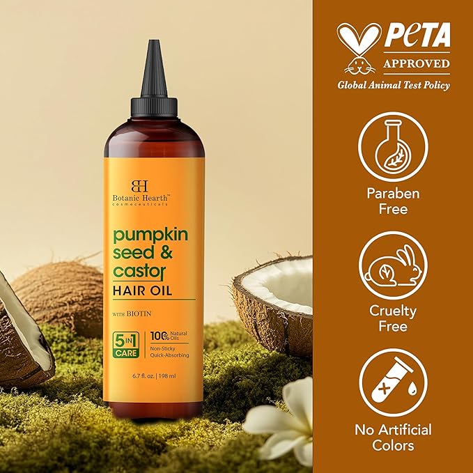 - Supports Stronger, Fuller Hair: Rich in essential fatty acids, pumpkin seed oil for hair growth helps improve the appearance of thinning hair, while castor oil strengthens and conditions.
