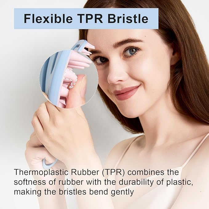 - Flexible Bristles — Made of soft TPR, the tapered bristles glides gently over your scalp. Wide bristle gaps help reduce hair pulling and breakage, making each wash comfortable