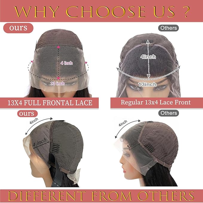 - Straight Frontal Wigs Human Hair, 13x4 WIDE LACE, more space to do free part or braids. NOT narrow lace, though narrow lace is much cheaper.