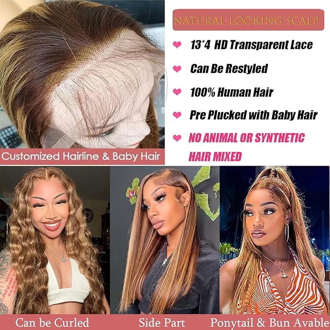 - Honey Blonde Wig Human Hair, Crafted entirely from human hair, NO ANIMAL HAIR OR SYNTHETIC MIXED, our wig guarantees softness, shine, and naturalness, offers unmatched realism and versatility, allowing you to experiment with various styles effortlessly.