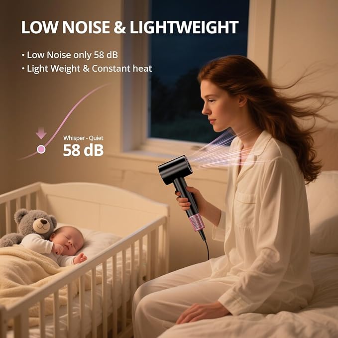 - 58 dB: This quiet blow dryer uses 8 layers of noise reduction technology, combined with german PI sound-absorbing materials, and optimizes the motor air duct, with a noise level of only 50 decibels. The body is light and portable, suitable for home travel.