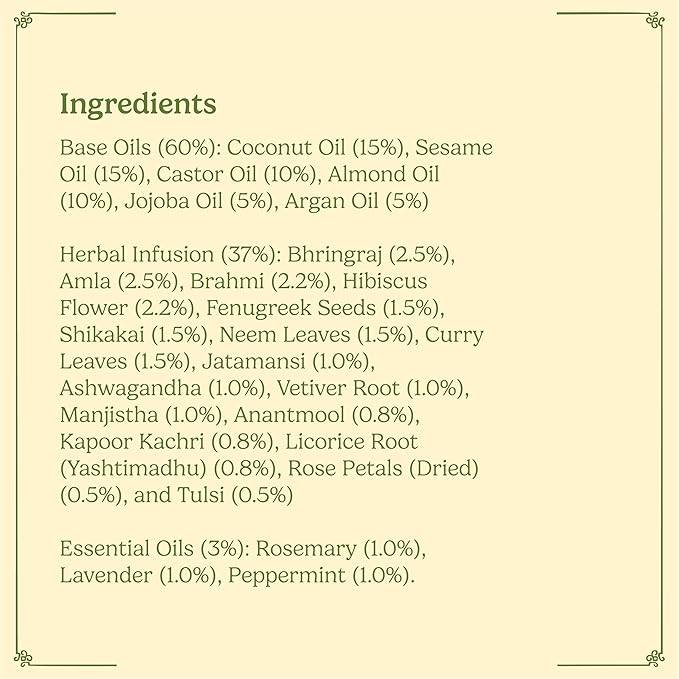 - AYURVEDIC HERBAL BLEND Bhringraj, amla, hibiscus, and rosemary infused with 30+ botanicals using the Taila Paka method for enhanced nourishment.