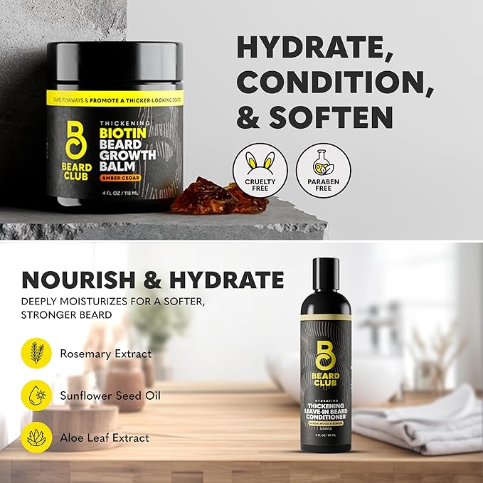 - Biotin Beard Balm & Leave-In Conditioner – Infused with Biotin, shea butter, and natural oils to soften coarse strands, tame flyaways, and smooth unruly hairs. Lightweight formula leaves your beard styled, fresh, and non-greasy