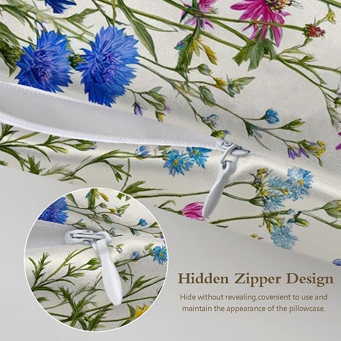 Silk Pillowcase for Hair and Skin Colorful Botanical Wildflowers Satin Pillowcase Standard Size with Zipper Silky Soft Cooling Satin Pillowcase Sleeping for Women 20"x26"