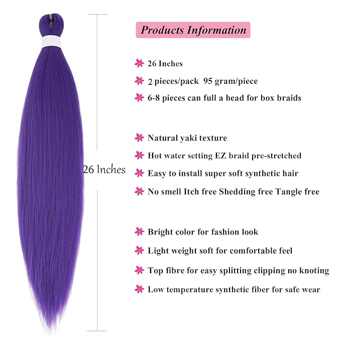 - ❤️ Purple Crochet Hair Packags: Prestretched Braiding Hair 52 inch Unfolded 26 Inch Folded, Packs Of 2, 7 Ounce. Itch Free Organic Non Toxic Yaki Pre-stretched Braiding Hair Extensions