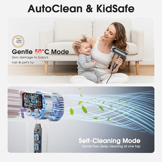 - 【Self-cleaning Function & Gentle Mode】This quiet hair dryer features a one-touch self-cleaning function that completes an automatic cleaning cycle in just 11 seconds, keeping the device pristine. It also includes a child mode that delivers gentle airflow and temperature to protect the delicate hair of babies or pets, ensuring safe use for the whole family