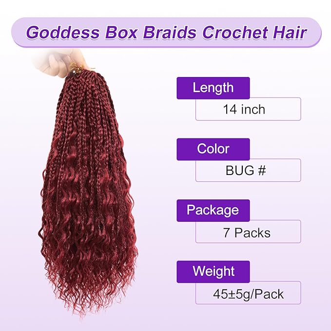 Eacia Goddess Box Braids Crochet Hair 14 Inch 7 Packs Burgundy Boho Box Braids with Curly Ends Pre looped Crochet Hair for Women(14 Inch, Burgundy#)