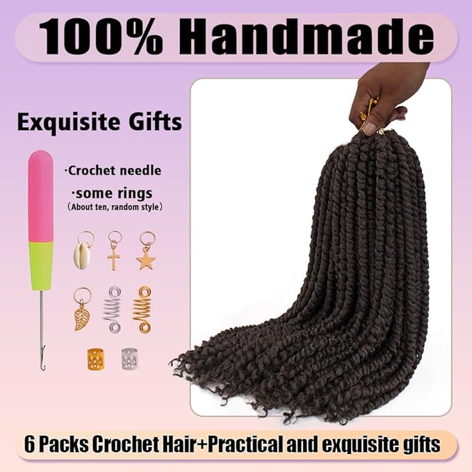 - Passion Twist Crochet Hair More Stands:16stands/Pack,96stands/6 Packs,Usually 5-6packs Have Full Head.Package One Crochet Hook,Some Crochet Rings(About Ten Random Style)